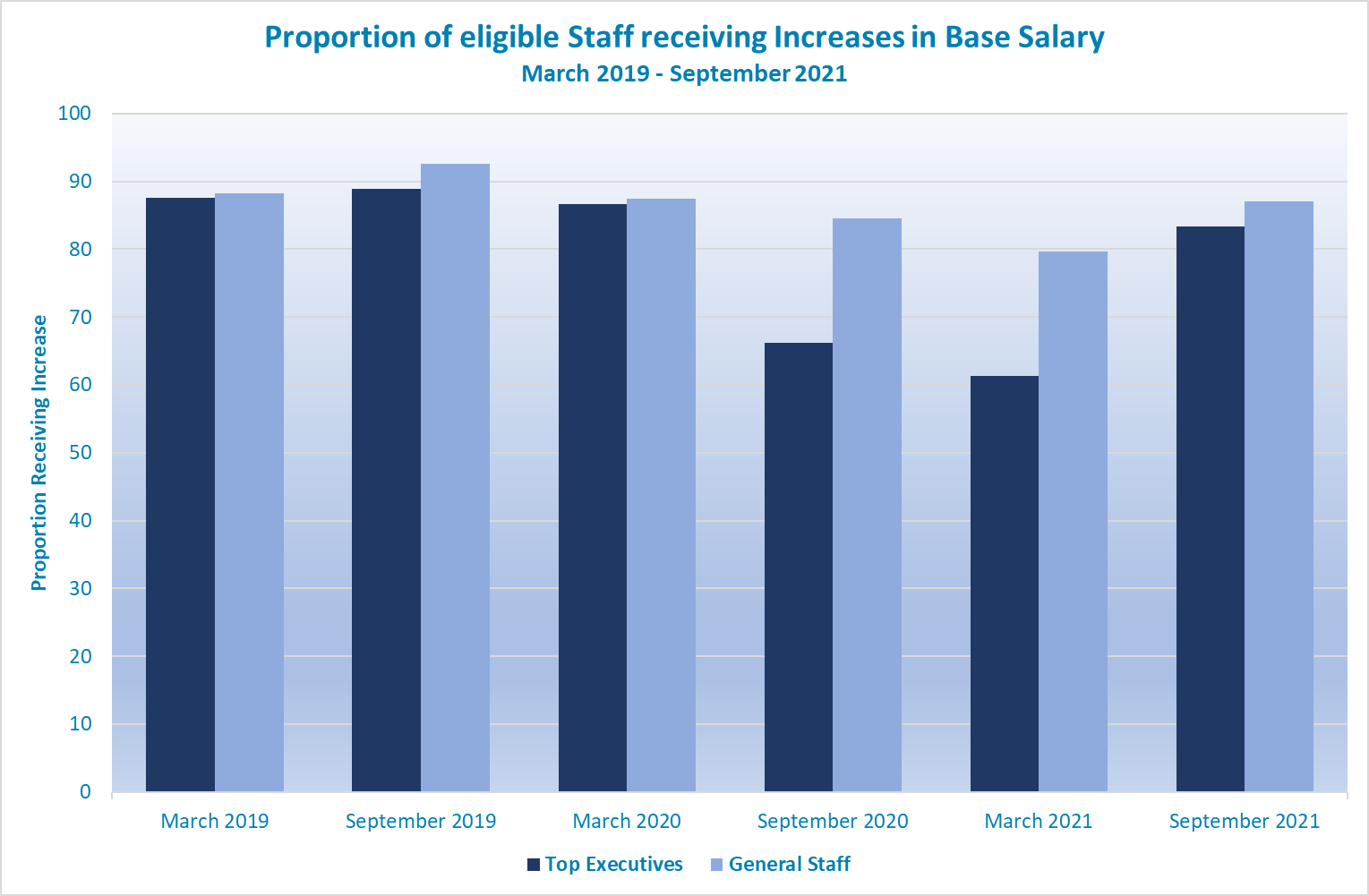 The first chart details the proportion of Top Executives and General Staff who have received increases in Base Salary in the twelve months leading to each data point. The chart clearly illustrates the reduction in the proportion of staff receiving increases in both September 2020 (i.e. six months after the initial arrival of C19) and in March 2021 (after a full twelve months living with C19). That reduction can be largely attributed to the impact of decisions by employers to impose pay freezes, or to defer pay reviews, to maintain employment during a period in which revenue and funding was markedly reduced.