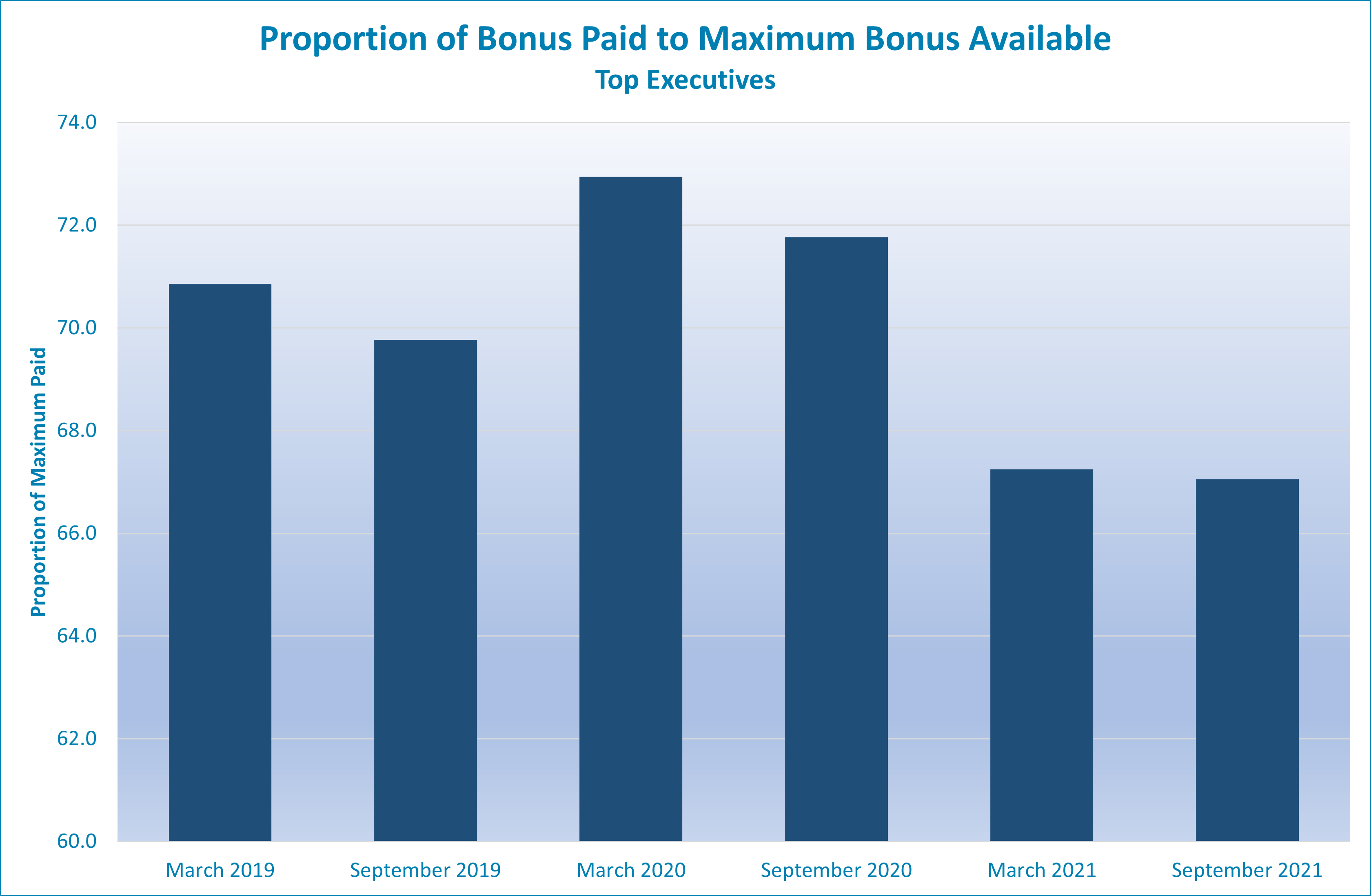 Perhaps not surprisingly, examination of the Maximum Bonus available in surveys between March 2019 (i.e. before the arrival Covid-19 in early 2020) and September 2021, showed very little variation in the level of payment available. This reflects the fact that bonus programs are typically included in employment agreements, and the amount available cannot be easily varied during the term of such contracts without some form of renegotiation.