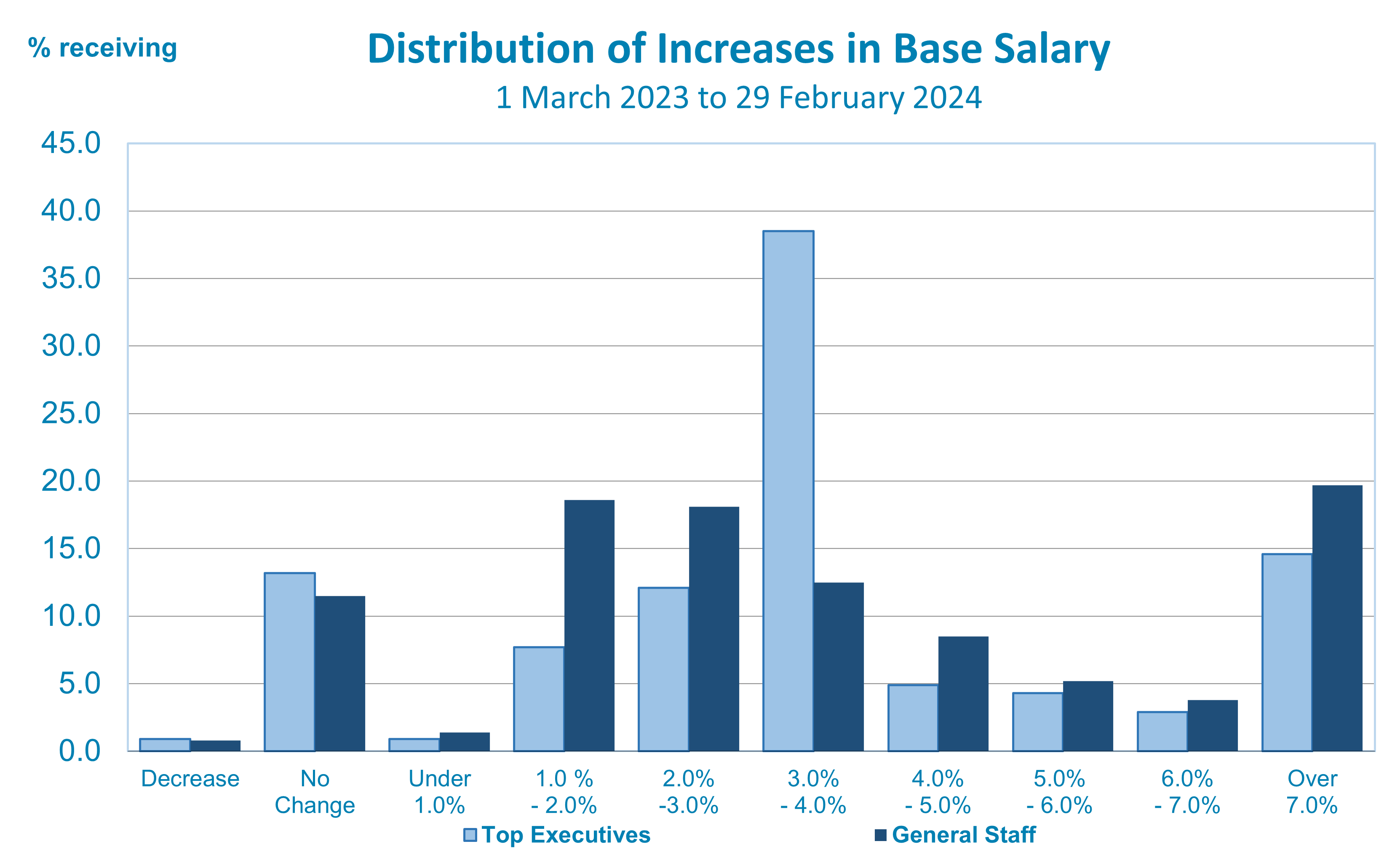Firstly, we all need to recognise that the Base Salary Movement figures are averages calculated from the individual movements received by all staff who qualify for increases. To get a clearer picture of how individuals are being rewarded, consider the distribution of those increases. MHR’s March 2024 results are revealing. At Top Executive level, 21.8 percent of executives received increases of more than 5.0 percent. For General Staff the figure was 28.7 percent. Clearly, a significant proportion of both groups received increases which exceed inflation – which does not fit with the common narrative.